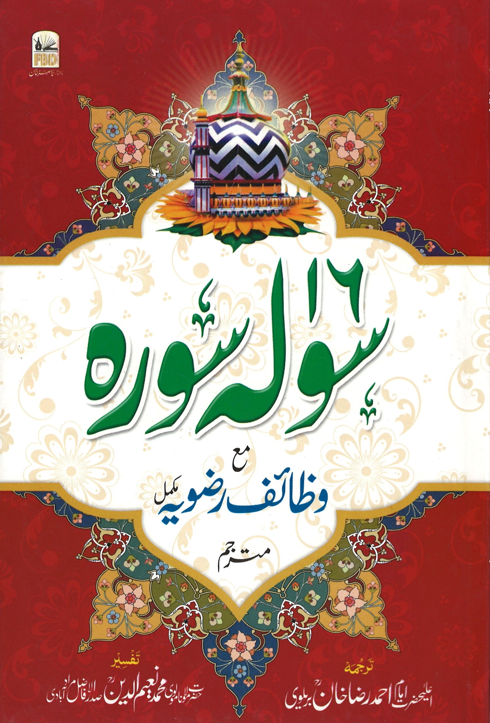 16 Surah with Wazaif Rizvia (complete) is likely a collection of 16 Surah & supplications (wazaif) compiled and Urdu Translation by Ahmad Raza Khan, a prominent Islamic scholar and theologian in South Asia. This collection is expected to encompass a wide array of prayers, supplications, and spiritual practices derived from Islamic teachings. Ahmad Raza Khan, known for his deep knowledge of Islamic jurisprudence, theology, and spirituality, likely compiled these supplications to provide guidance and assistance to Muslims in their spiritual journey.