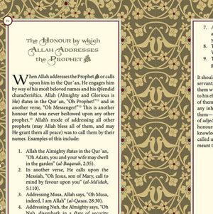 However, in modern times the science of Khasa'is has been neglected, to the point that many Muslims have become unaware of its existence. This present volume is an attempt to rectify this deficiency, to present the Khasa'is to an English-speaking audience in a manner befitting the unique honor, majesty, and significance of Allah's Final Messenger ﷺ. Each page is the result of a collaboration of a world-class team of translators, editors, designers, typesetters, and printers from across four continents, and every detail represents a fusion of traditional knowledge and design elements with state-of-the-art book production methods. The result is a work the like of which has never before been printed in the English language, that is sure to occupy a place of honor in the library or home.