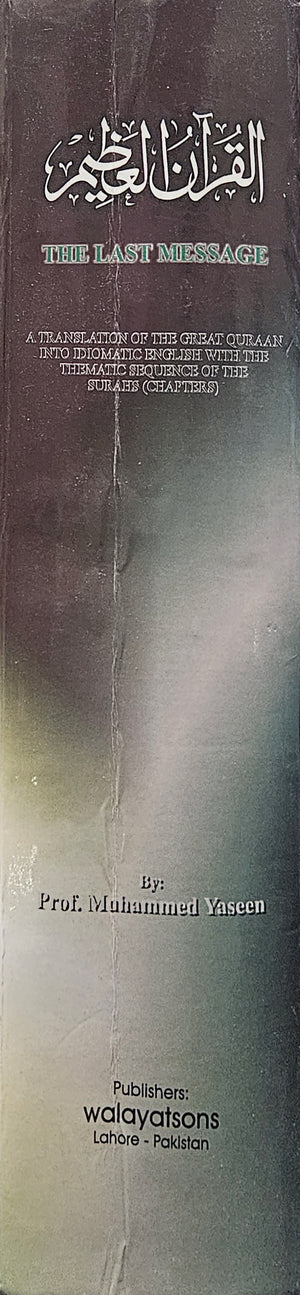 AL Quran Al Kareem. The Last Message. a Translation of the great Quran Into Idiomatic English with the Thematic Sequence of the Surah's. By Prof. Muhammed Yaseen. 2001. (USED)