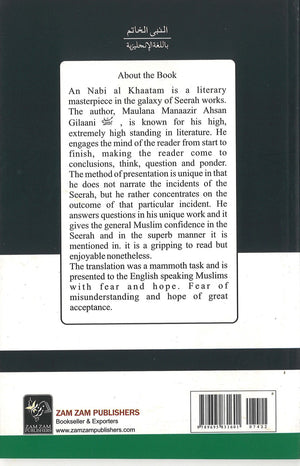 An Nabi al Khaatam is a literary masterpiece in the galaxy of Seerah works. The author, Maulana Manaazir Ahsan Gilaani, is known for his high, extremely high standing in literature. He engages his kind of the reader from the start to finish, making the reader come to conclusions, think, question and ponder. The method of presentation is unique in that he does not narrate the incidents of the Seerah, but rather concentrates on the outcome of that particular incident. He answers questions in his unqiue work and it gives the general Muslim confidence in the Seerah and in the superb manner it is mentioned in. It is gripping to read but enjoyable nonetheless. The translation was a mammoth task and is presented to the English speaking Muslims with fear and hope. Fear of misunderstanding and hope of great acceptance.