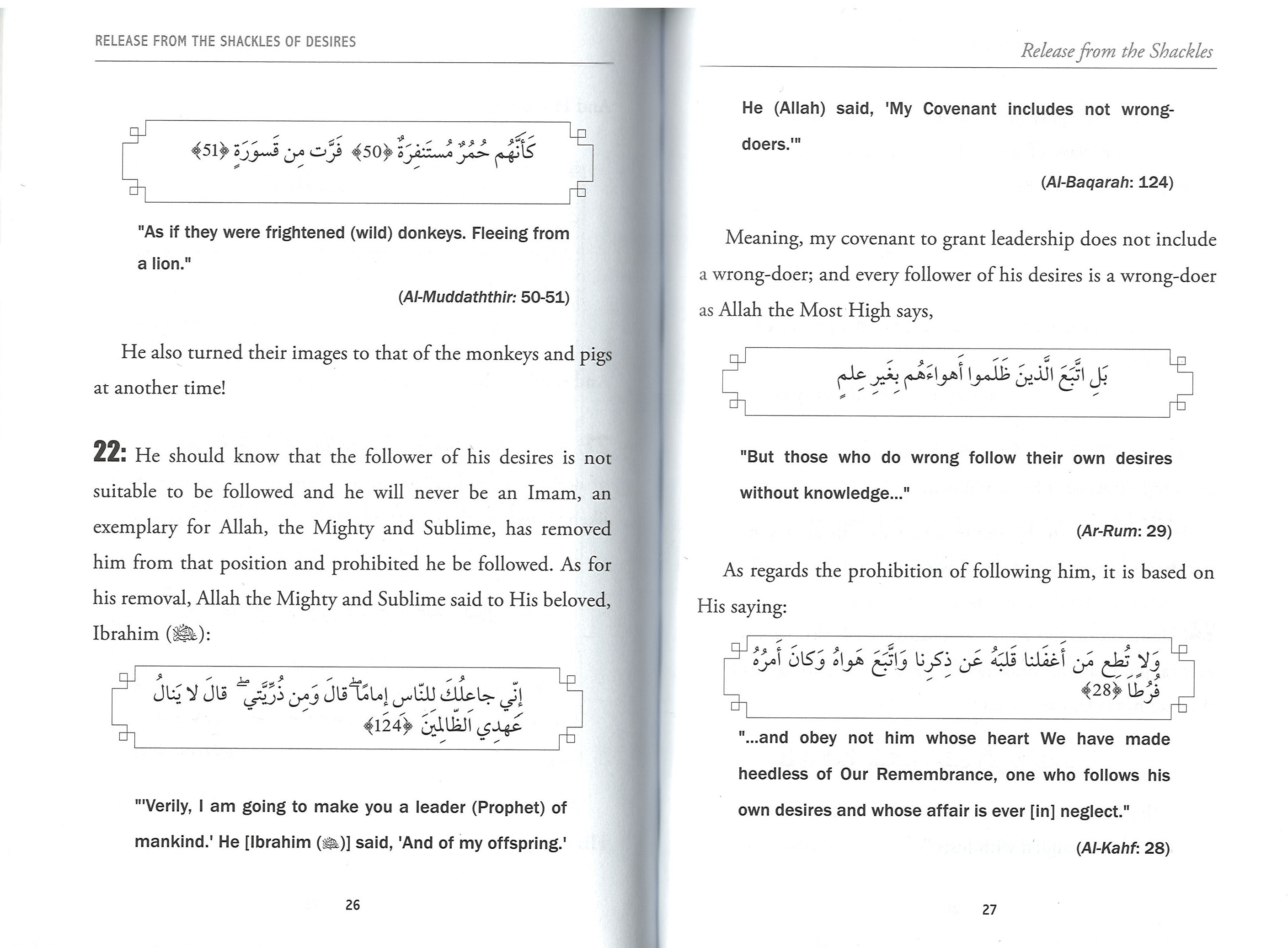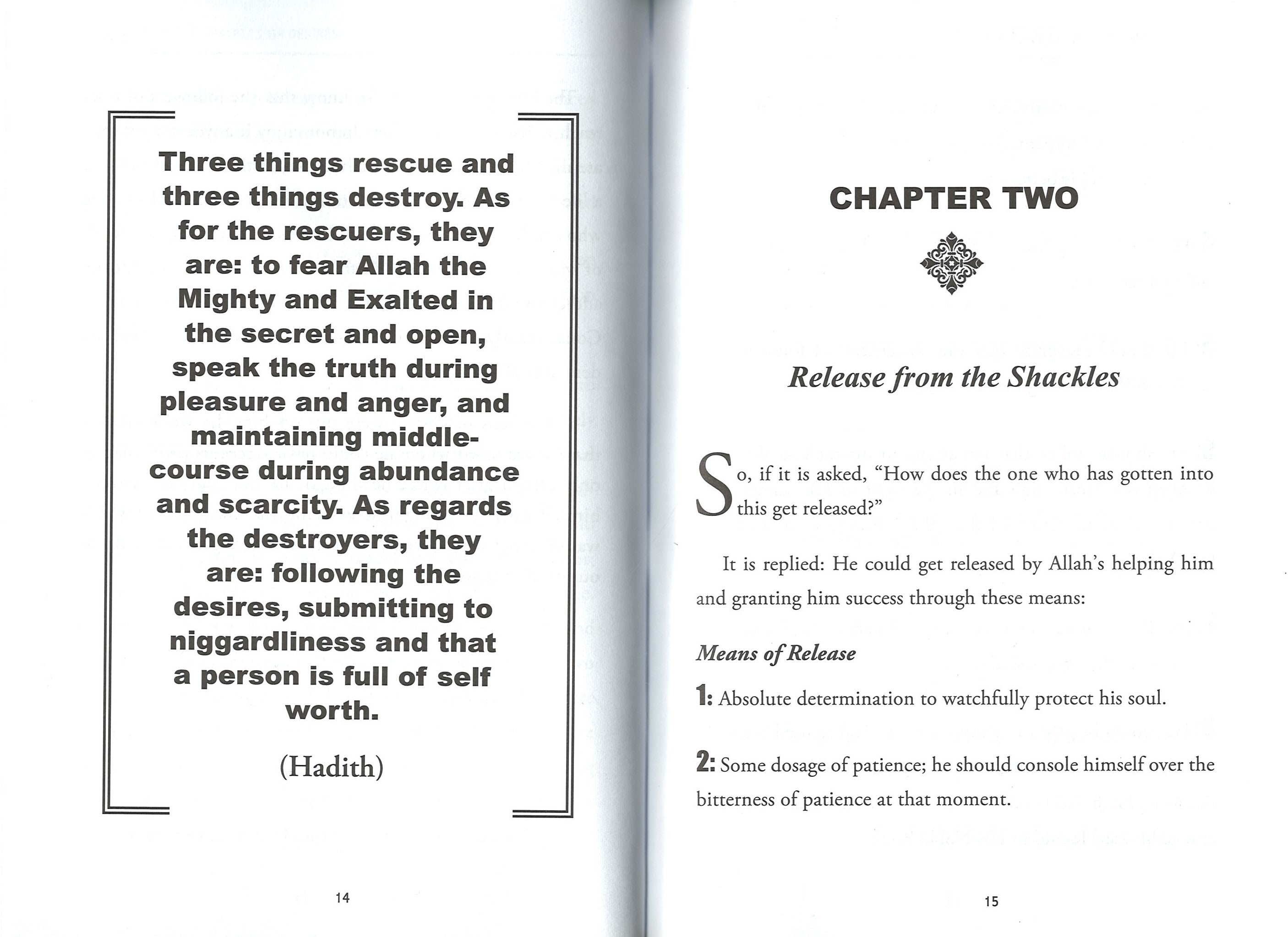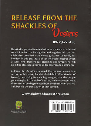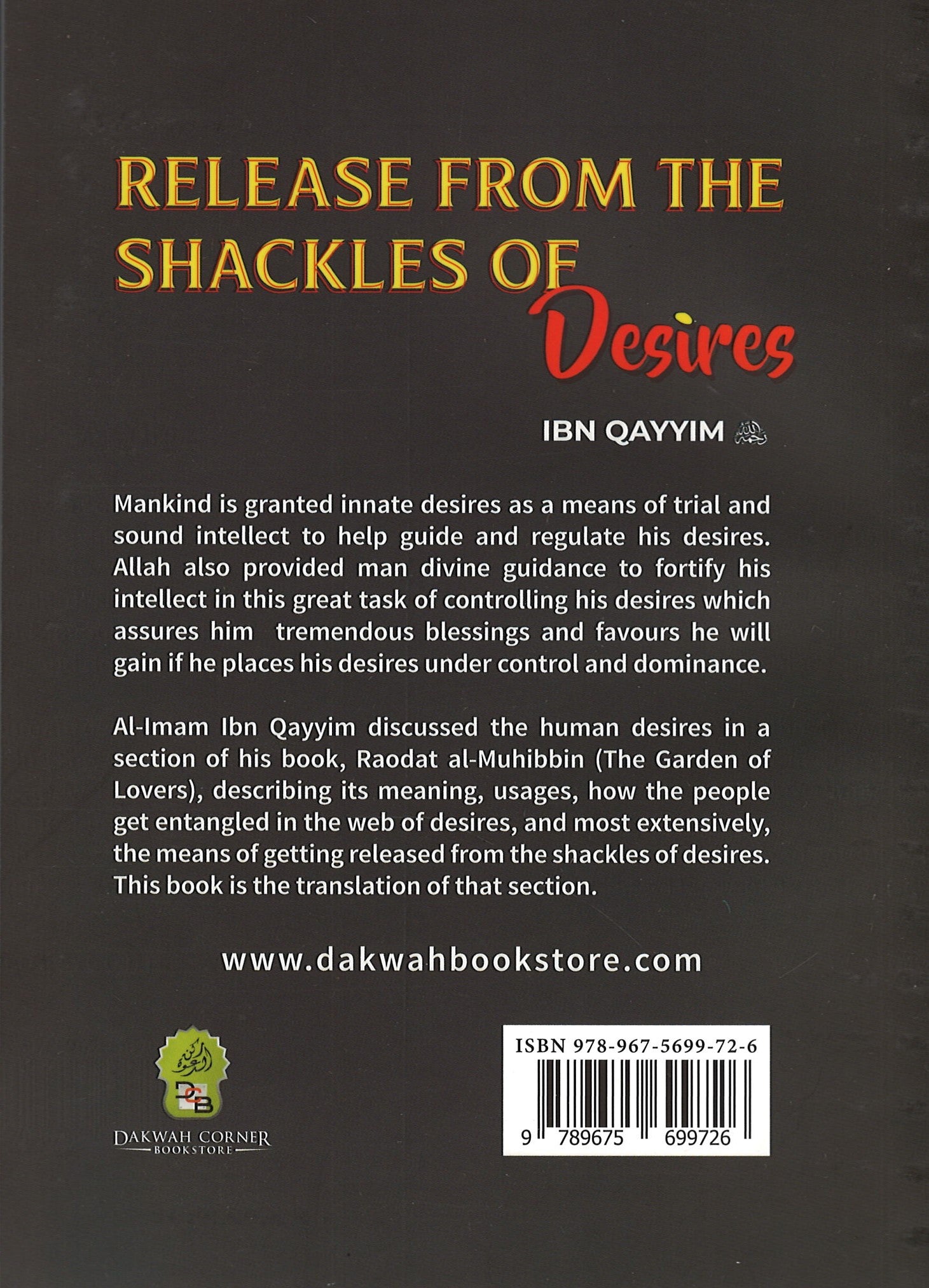 This instructive book is broken into two parts, each of which provides insightful advice. Ibn Qayyim examines the essence of wants in the first section, offering profound insights into their cause and intent. The second section of the book concentrates on doable methods for restraint and regulation of our wants. He also emphasizes the critical function of asking for help from the Divine, realizing the significance of relying on Allah's direction and assistance in our quest for self-mastery. Ibn Qayyim provides a deep understanding and useful advice to assist people in navigating the difficulties of their desires. "Release from the Shackles of Desires" is an invaluable tool for anyone attempting to comprehend and conquer the difficulties presented by their own inner impulses, eventually aiming for spiritual and personal development. Mankind is granted innate desires as a means of trial and sound intellect to help guide and regulate his desires. Allah also provided man divine guidance to fortify his intellect in this great task of controlling his desires which assures him tremendous blessings and favors he will gain if he places his desires under control and dominance. Al-Imam Ibn Qayyim discussed human desires in a section of his book, Raodat al-Muhibbin (The Garden of Lovers), describing its meaning, usages, how people get entangled in the web of desires, and most extensively, the means of getting released from the shackles of desires. This book is the translation of that section