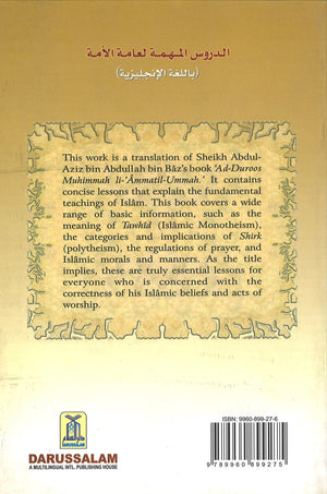 This work is a translation of Shaikh Abdul Aziz bin Baz's book 'Ad-Duroos Al-Muhimmah li-Ammatil-Ummah.' It contains concise lessons that explain the fundamental teachings of Islam. This book covers a wide range of basic information such as the meaning of Tawhid (Islamic monotheism), the categories and implications of Shirk (polytheism), the regulations of prayer, and Islamic morals and manners. As the title implies, these are truly essential lessons for everyone who is concerned with the correctness of his Islamic beliefs and acts of worship.