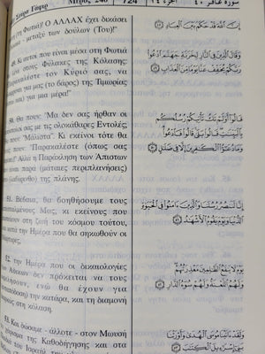 Greek Qur'an Translation with Arabic text This is a complete Greek translation of the Holy Qur'an, including the original Arabic text. Deluxe hardback binding and excellent paper quality.