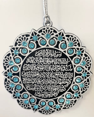 This unique geometric star ornament is double-sided, one side reads “Ayet Al Kursi” and the other side reads “Ayet Al Safar” in Arabic. The embedded rhinestones add an elegant touch, making this piece the perfect accessory to hang in the car, home, office and more! Makes a perfect gift also!