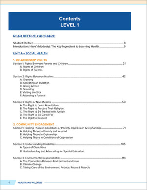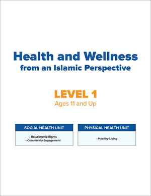 Level 1 presents topics suitable for the age group of 11 and above. The first unit, Social Health, deals with topics of navigating healthy relationships between Muslims, parents and children, and with non-Muslims. It also provides a road map for integrating youth with community engagement including helping those in need, understanding disabilities, and taking care of the environment. The second unit, Physical Health, connects healthy eating and exercise with verses from the Quran and ahadith as well as preventive measures of common lifestyle diseases.