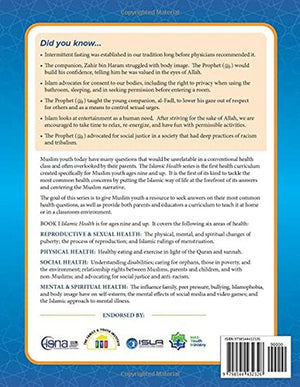 Islamic Health is comprehensive health textbook series with real-life application of researched-based health skills in an Islamic framework. It includes key words, chapter activities, chapter reviews, resources, and more. Its goal is to give Muslim youth a resource to seek answers on their most common health questions, as well as provide both parents and educators a curriculum to teach it at home or in a classroom environment.