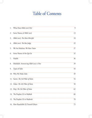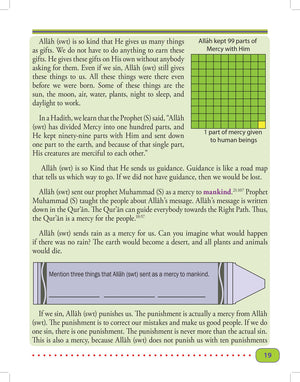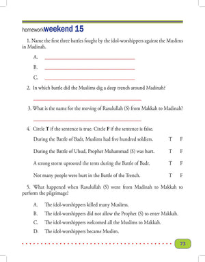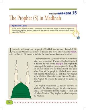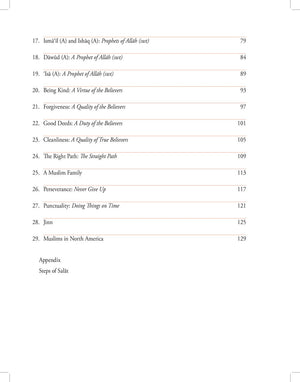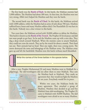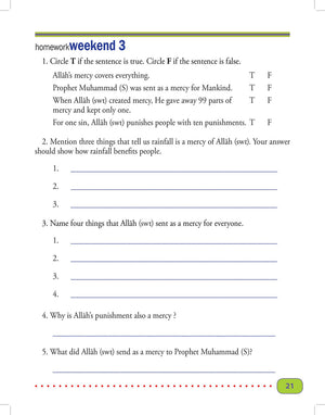 The Level 3 book is for 7-9 year old children, who have completed the Level 2 book from Weekend Learning or have similar Islamic knowledge. Ideally, third-grade students should use this book. This may be their second or third year in a formal Islamic class. The lessons in the book gradually begin to spark inquisitiveness of students. For example, what does Allah do, why we do salah, how Rasulullah (S) treated others and so forth. Students will learn different names of Allah, understand mercy of Allah, learn additional names of the Qur’an, and the types of salah. The concept of 5-pillars of Islam is reintroduced with additional emphasis. In addition to learning short history of some of the prophets, students will also learn an outline of the Makkah and Madinah periods of Rasulullah’s (S) life. Several lessons discuss importance of good deeds, forgiveness, cleanliness, perseverance and other Islamic values and morals.