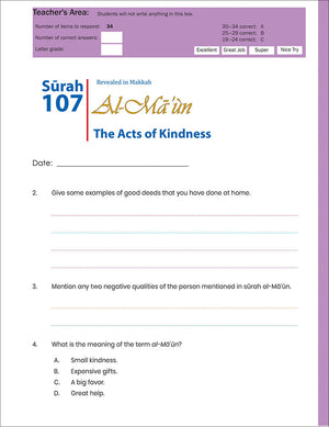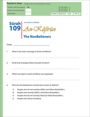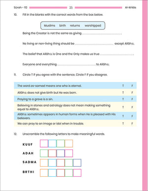 Juz'Amma Workbook Volume 1 covers Surah Fatihah and Surah An-Nas to Surah Al-Qadr (surah #97). The workbook is a user-friendly, illustrated companion to the widely popular textbook titled Juz 'Amma for School Students. The workbook has a variety of activities especially designed for younger students. Each surah has about 10 or more quizzes and activities with different levels of challenges. The purpose of the workbook is to stimulate your child's curiosity and encourage his or her imagination. The workbook has chapter reviews and fun-filled, thought-provoking review questions to get the most out of the textbook. The review questions and activities maximize understanding, encourage constructive evaluation, and provide for systematic learning.