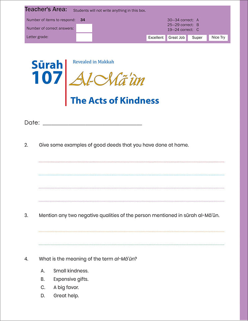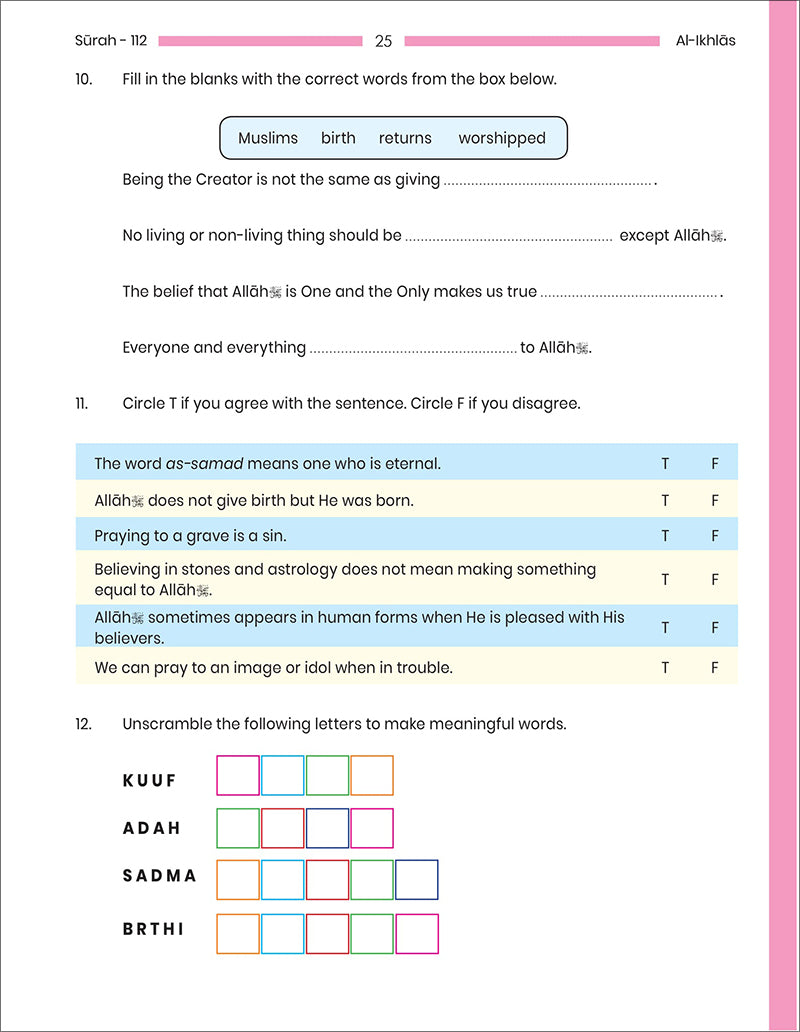 This is a thoroughly revised, colored version of Juz'Amma Workbook Volume 1, which covers Surah Fatihah and Surah An-Nas to Surah Al-Qadr (surah #97). Each surah has a large number of theme-based questions and activities to reinforce learning. This is an ideal workbook to accompany the widely popular textbook titled Juz 'Amma for School Students.