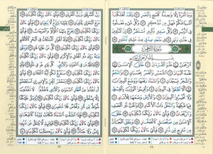 This is a 27 Individual Juz of the Holy Quran with color coded Tajweed Rules in Soft Cover. It also has the meanings and short explanation on the margins of each Page. In this Mushaf letters related to the Tajweed rules are distinguished within the text by the use of different colors that indicate areas of slow recitation. This technique helps simplify the rules of recitation for the reader in order to encourage and facilitate correct Quranic recitation.