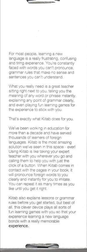 Kiitab uses advanced dot code technology that senses where you touch on a page and is able to match that to the correct sound that is contained in a data file inside the device. The best part is that Kiitab is a one-time investment that can be used with all future and past Kiitab compatible products.