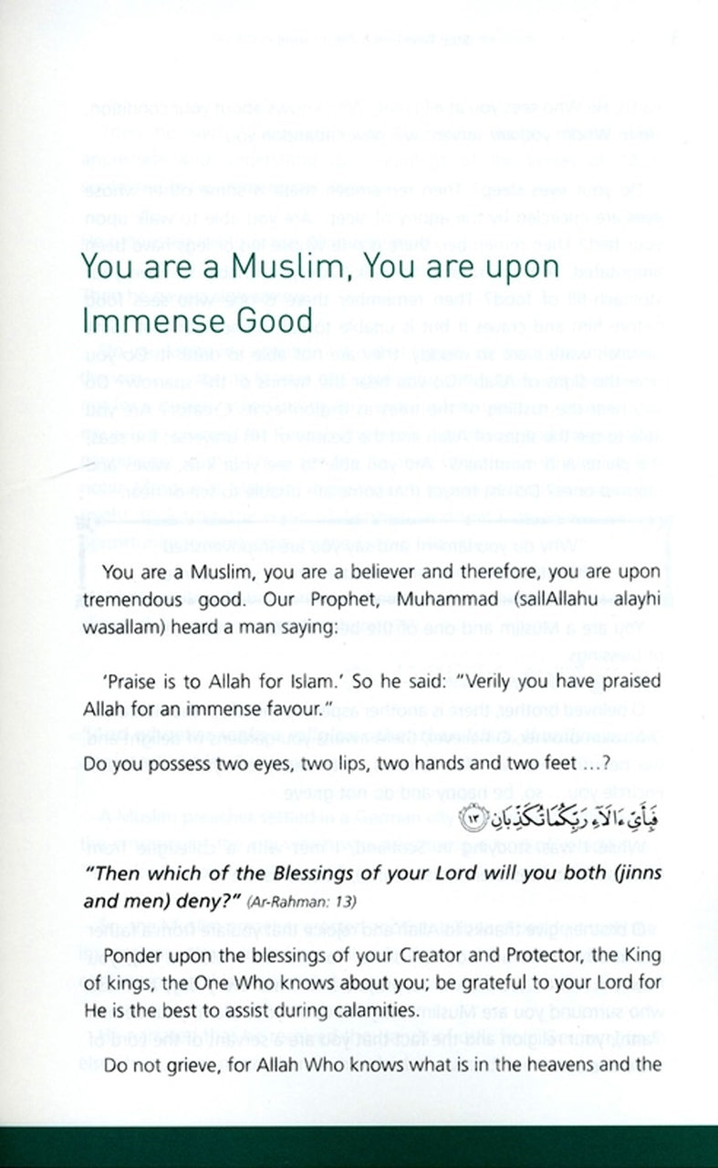 This book seeks to guide everyone sorrowing over with one thing or the other in a manner different from other books which discuss worry, sadness and grief; and from those which discuss fortune (or success). It addresses the heart, convinces the mind and moves Faith. It removes confusion from the hearts and souls of many of the children of Islam, those whom Shaytan invites to wretchedness, sin, despair, grief, and hopelessness in the Mercy of Allah.
