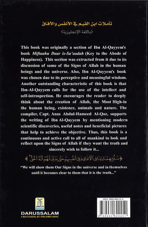 From the back cover: "This book was originally as section of Ibn Al-Qayyim's book Miftaahu Daar is-Sa'aadah (Key to the Abode of Happiness). This section was extracted from it due to its discussion of some of the Signs of Allah in the human beings and the universe. Also, Ibn Al-Qayyim's book was chosen due to its perceptive and meaningful wisdom. Another outstanding characteristic of this book is that Ibn-Al-Qayyim calls for the use of the intellect and self-introspection. He encourages the reader to deeply think about the creation of Allah, the Most High-in the human being, existence, animals, and nature. The compiler, Capt. Anas Abdul-Hameed Al- Qoz, supports the writing of Ibn Al-Qayyim by mentioning modern scientific discoveries, useful notes and beneficial pictures the help to achieve the objective. Thus, this book is a continuous and active call to all of mankind to look and reflect upon the Signs of Allah of they want the truth and sincerely with to follow it. "We will show them Our Signs in the universe and in themselves until it becomes clear to them that it is the truth…"