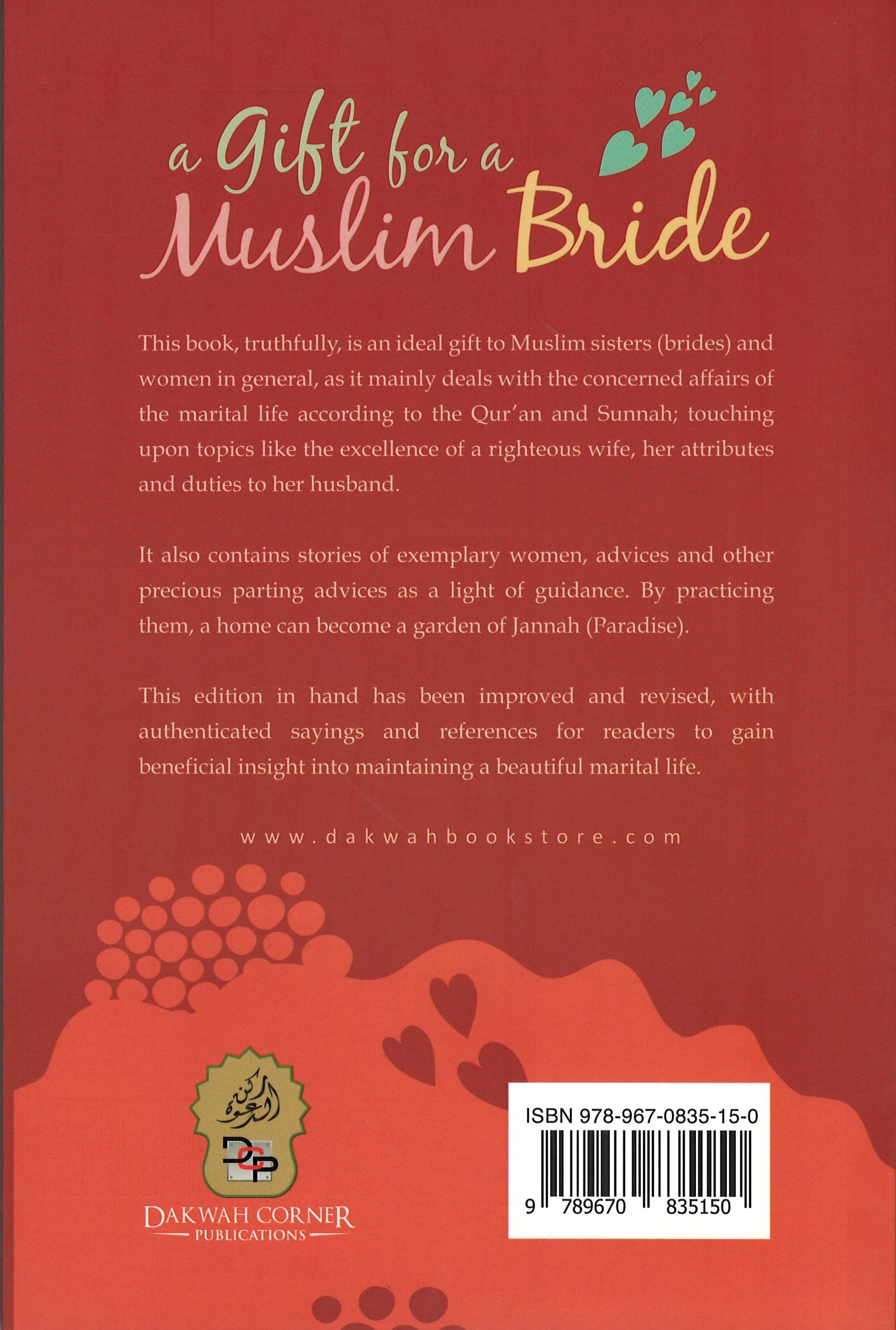 This book, truthfully, is an ideal gift to Muslim sisters (brides), as this book mainly deals with the concerned affairs of newly married life according to the Qur'an and Sunnah; touching upon topics like the excellence of a righteous wife, her attributes and duties to her husband, How to live amicably with in-laws avoiding all domestic disputes and How to harmonise with husband's sentiments and preferences, to capture his heart and inclusive attention. etc. A Gift for a Muslim Bride also contains stories of some exemplary women, advices and other precious parting advices as a light of guidance. By practising them, a home can become a garden of Jannah. This book should be read in sequence cover to cover and pass the advices on to other Muslim sisters.