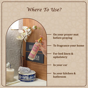 Transform your space Dukhni mists are ideal for refreshing fabrics, prayer mats, furniture, and more. Versatile as air fresheners, car sprays, or for revitalizing your kitchen and bathroom, they're perfect for any moment, be it pre-prayer, pre-guests, or post-cleaning.