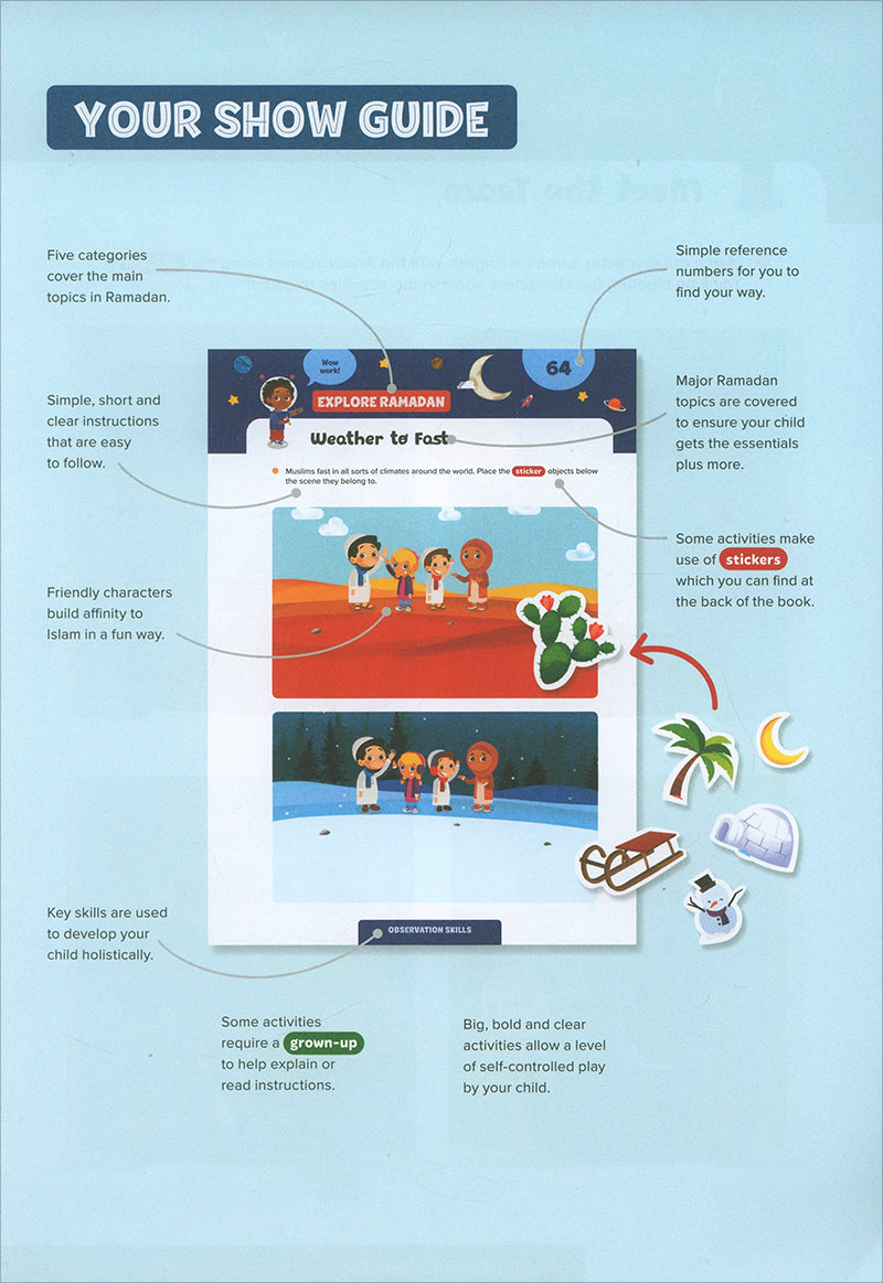- The activities we’ve included are both practical and contextualized so your child will learn not just about the dos and don’ts of Ramadan, but also how Ramadan affects their lives, their environment, and the world around them.