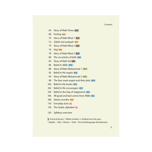 The books have been developed to ensure that they are enjoyable whilst being comprehensive, reliable and meaningful. Elements from all core subjects are covered in the textbooks in an age-appropriate manner: QurÊ ¾Ã„ nic stories, Islamic beliefs (Ê ¿aqÄ «dah), religious rulings and rituals (fiqh) and major episodes from the life of Prophet Muá ¸ ¥ammad ï · º, as well as areas of personal development.