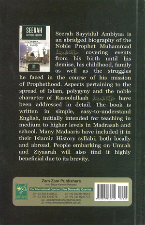 SEERAH SAYYIDUL AMBIYA (S.A.W.W) is a comprehensive life story of the Noble Prophet Muhammad (S.A.W.W)covering events from birth till his demise, his childhood, family and struggles in the course of his mission of Prophethood, Aspects pertaining to the spread of Islam, Polygamy and the noble Character of Rasulullah (S.A.W.W) have been addressed in some details.