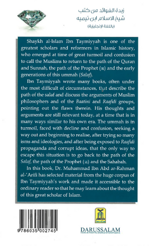 In this book, Dr. Muhammad Ibn Abd ar-Rahman al-' Arifi has selected material from the huge corpus of Ibn Taymiyyah's work and made it accessible to the ordinary reader so that he may learn about the thought of this great scholar of Islam.