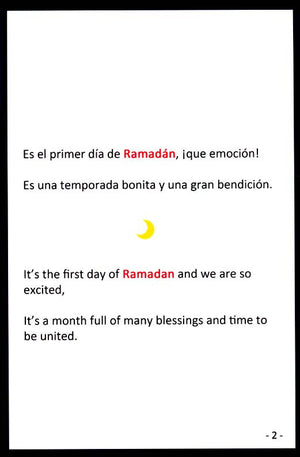 Ramadan is a festive and important time for Muslims, being one of the pillars of the Islamic faith and the month in which the Quran was first revealed. In this book, we will follow a typical Muslim family while they experience their first fast of Ramadan. Get ready to learn and enjoy it with them!El mes de Ramadán es muy importante para los musulmanes, siendo uno de los pilares de la fe islámica y cuando se reveló el Corán por primera vez. En este libro, seguiremos a una familia musulmana mientras realizan su primer día de ayuno durante el mes de Ramadán. Prepárense para aprender y disfrutar junto a ellos.