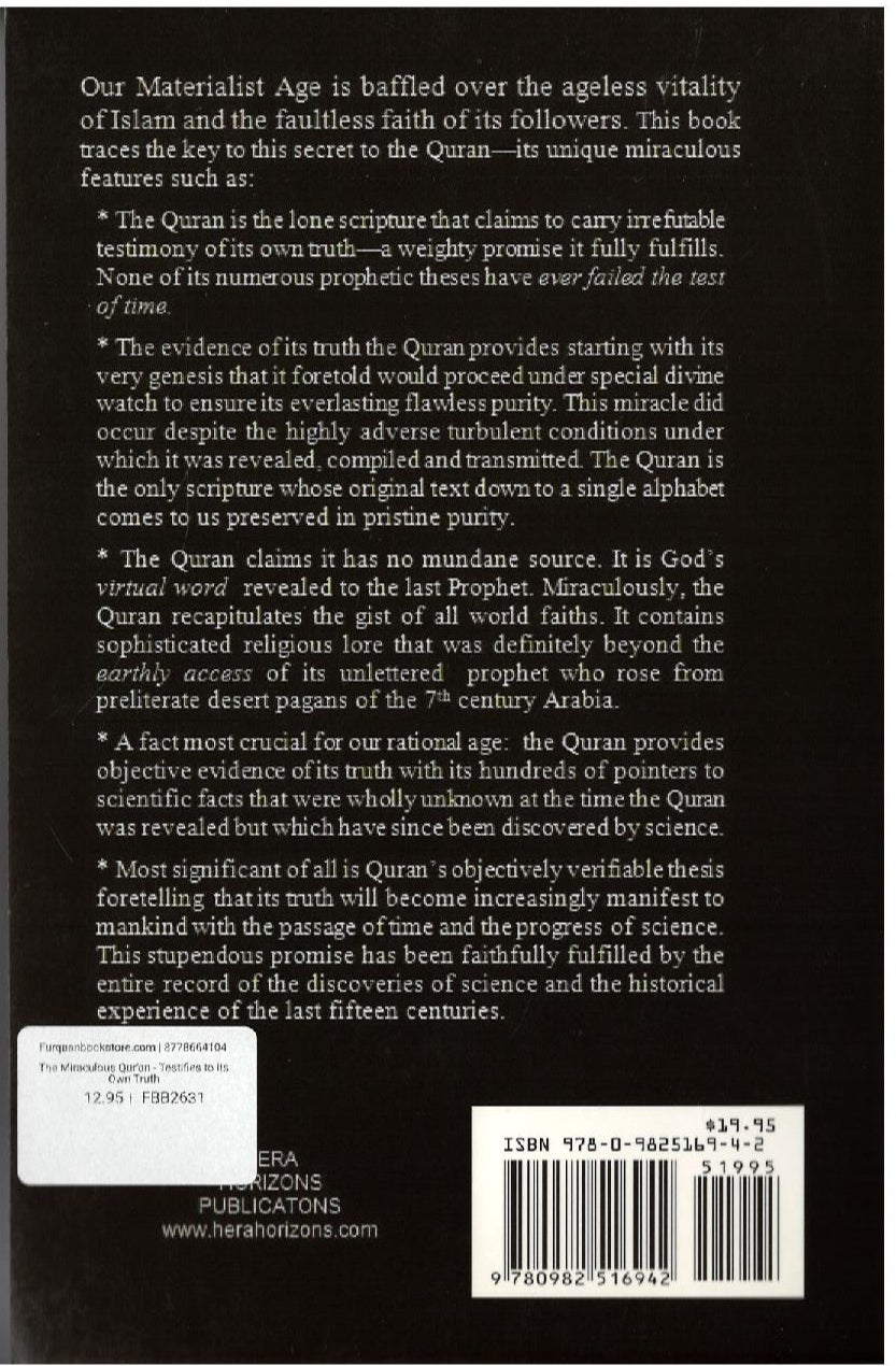 -The Quran is the lone scripture that claims to carry irrefutable testimony of its own truth--a weighty promise it fully fulfills. None of its numerous prophetic theses have ever failed the test of time.