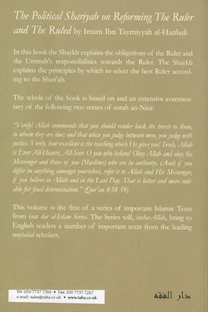 In this book Imam Ibn Taymiyyah explains the obligations of the ruler and the ummah's responsibilities towards the Ruler. The shaykh explains the principles by which to select the best Ruler according to Shari'ah. The Book is based on an Extensive commentary of the following verses of Surah Nisah: 'Verily, Allah commands that you should render back the trusts to those, to whom they are due, and that when you judge between men, you judge with justice. Verily, how excellent is the teaching which He gives you! Truly, Allah is Ever All-Hearer, All-Seer. O you who believe! Obey Allah and obey the Messenger, and those charged with authority among you. If you differ in anything among yourselves, refer it to Allah and His Messenger, if you do believe in Allah and the Last Day: that is best, and most suitable for final determination.' TM Qur'an 4:58-59